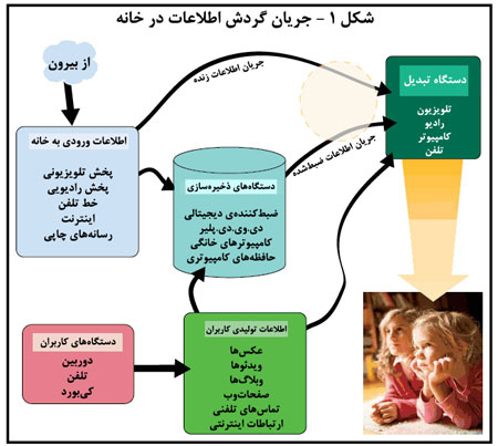 شکل (۱) فرآیند گردش اطلاعات در خانه را نشان میدهد که چگونه اطلاعات بهطرق مختلف تولید میشوند تا به مرحلهی مصرف برسند. بخشی از اطلاعات از طریق رسانههای خارج از خانه از قبیل رادیو، تلویزیون، مطبوعات، اینترنت و غیره به شهروندان منتقل میشود. همچنین هر شخص از طریق ابزارهای رسانهای کوچکی که در اختیار دارد از قبیل دوربینهای خانگی، دستگاه تلفن، کامپیوتر شخصی و غیره، حجمی از اطلاعات را نیز خود تولید میکند. بدین ترتیب مصرف رسانهای هر شخص ترکیبی از اطلاعاتی است که از منابع گوناگون به او میرسد.