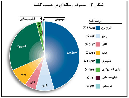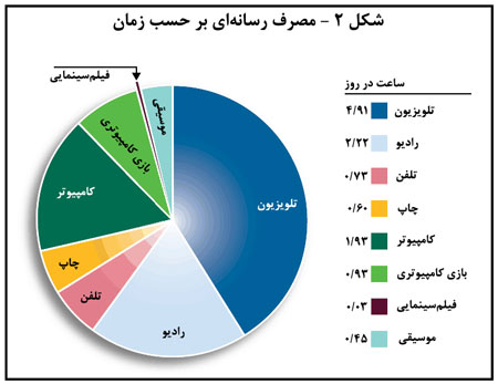 حتما برایتان پیش آمده که در هنگام کار با کامپیوتر همزمان موسیقی گوش کنید یا موقع خواندن روزنامه، تلویزیون هم روشن باشد و نیمنگاهی هم بهتصاویر آن داشته باشید، در این حالت شما در حال مصرف اطلاعات از دو رسانهی مختلف در یک زمان واحد هستید. در این گزاش یک ساعت استفاده از اطلاعات از دو رسانهی مختلف، به اندازهی دو ساعت مصرف رسانهای محاسبه شده و بهعبارتی یکشبانه روز با قابلیت مصرف اطلاعات بیشتر از ۲۴ ساعت در نظر گرفته شده. اینچنین است که مصرف میانگین روزانه حدود ۱۲ ساعت اطلاعات آنهم تنها برای موارد غیرکاری قابلپذیرش بهنظر میرسد. یک میلیارد و ۲۷۳ هزار ساعت زمانی است که برای مصرف همهی شهروندان در طول سال محاسبه شده است. توزیع این مصرف بین رسانههای مختلف در شکل (۲) ترسیم شده.