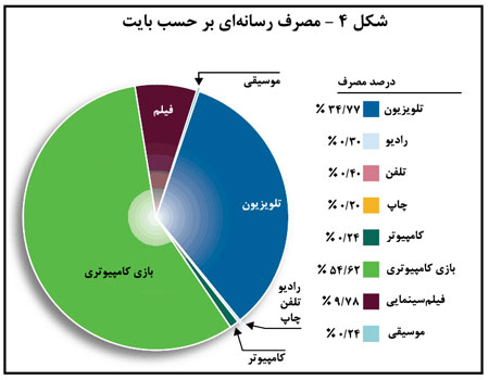 شکل (۴) نشان میدهد بازیهای کامپیوتری موفق شدهاند پیشتازی تلویزیون در مصرف رسانهای شهروندان در این بخش را پشتسر بگذارند. میتوان گفت بازیهای کامپیوتری، تلویزیون و فیلمهای سینمایی آنچنان بخش گستردهای از حجم اطلاعات ردوبدلشده را بهخود اختصاص دادهاند که جایی برای دیگر رسانهها باقی نمانده است. بازیهای کامپیوتری (حدود ۵۴ درصد)، تلویزیون (حدود ۳۵ درصد)، فیلم سینمایی (حدود ۱۰ درصد) و پس از آن رادیو، کامپیوتر، موسیقی، تلفن و رسانههای چاپی هر کدام با کمتر از یکدرصد در جدول قرار گرفتهاند. در بین انواع بازیهای کامپیوتری نیز بازیهای پیشرفته که برای انجام آنها سختافزار و نرمافزارهای خاصی لازم است صدرنشین هستند و پس از آن کنسولهای بازی قرار گرفتهاند.