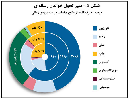 شکل (۵) نشان میدهد که سهم رسانههای چاپی در مصرف رسانهای از نیم قرن پیش تاکنون همراه رو بهکاهش بوده است. اگر این رقم در ۱۹۶۰ حدود ۲۶ درصد و در ۱۹۸۰ حدود ۱۲ درصد بود، در سال ۲۰۰۸ بهحدود ۹ درصد رسیده است. اما در مقابل در سال ۲۰۰۸ با رقم ۲۷ درصدی مصرف کلمات در ارتباطات کامپیوتری مواجه هستیم که بخش قابل توجهی از آن از طریق خواندن دریافت شده است.
